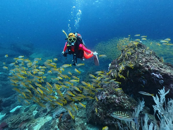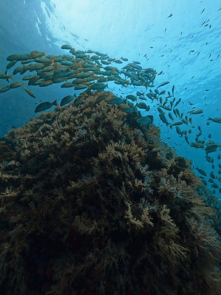 ソフトコーラルで覆われた岩に群れる魚や、